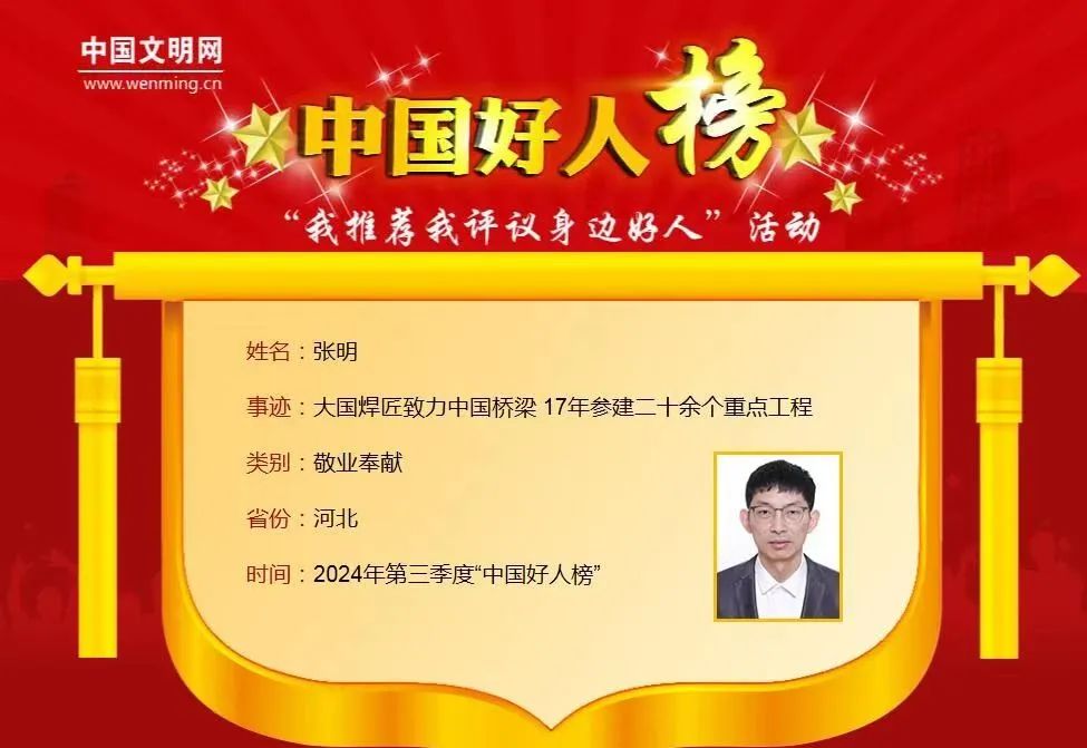 11月12日,中央精神文明建設辦公室主辦的2024年第三季度“中國好人榜”公布,中鐵山橋焊接特級技師張明入選2024年第三季度敬業奉獻“中國好人榜”榜單。